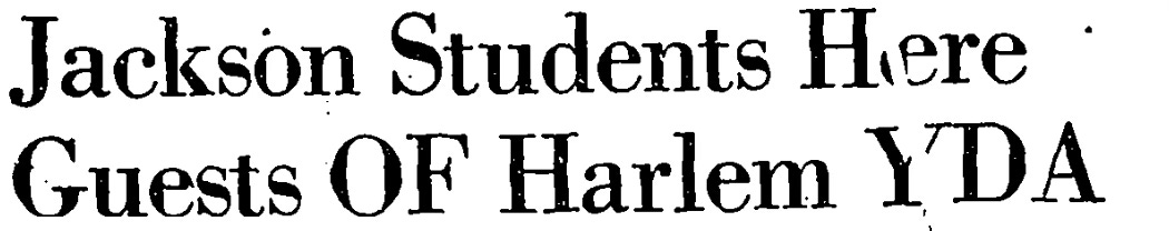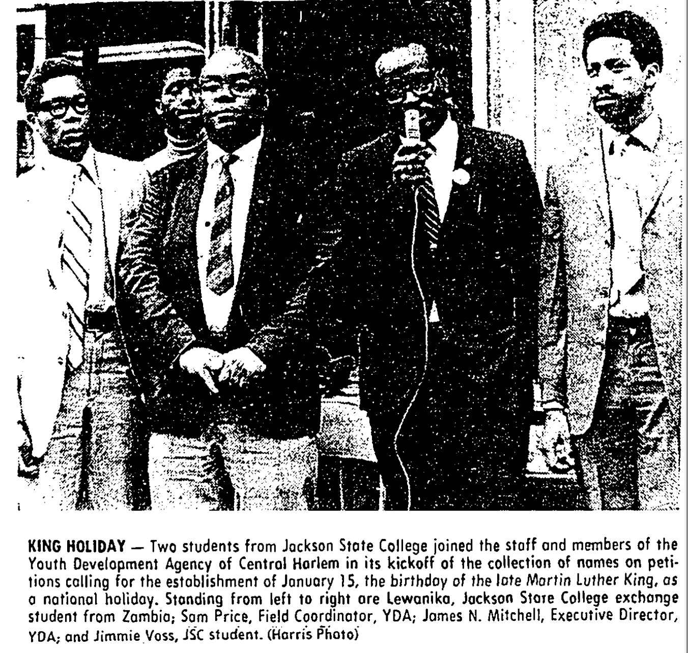 The story reported that two students from Jackson State College in Mississippi, were invited to Harlem in the aftermath of shootings by Mississippi State Police, who opened fire on a dormitory, killing two young people and wounding nine. Sammy Price, then Field Coordinator for the Youth Development Agency in Harlem, extended the invitation while also organizing a drug addiction awareness week culminating in a parade honoring the deaths of Harlem youth, and secondarily, organizing a ““drive to collect signatures in support of a bill declaring January 15, the birthday of the late Martin Luther King, a national holiday.” A photo accompanied the story: