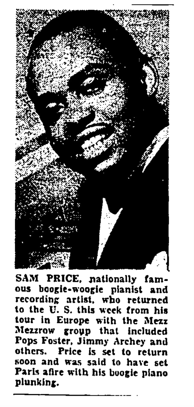 Here’s one other item, relating to Sammy Price’s development as a boogie-woogie pianist. It’s from a 1948 edition of Harlem’s Amsterdam News, reporting on his return from a tour with the Mezz Mezzrow band and noting Sammy’s popularity in Paris, where he became a huge star.